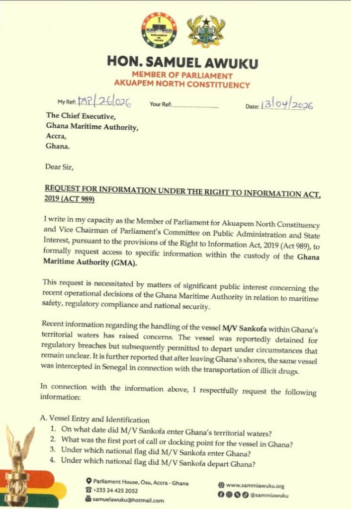 Member of Parliament for Akuapem North, Samuel Awuku, has formally requested detailed information regarding the arrest and detention of the vessel M/V Sankofa within Ghana’s territorial waters.