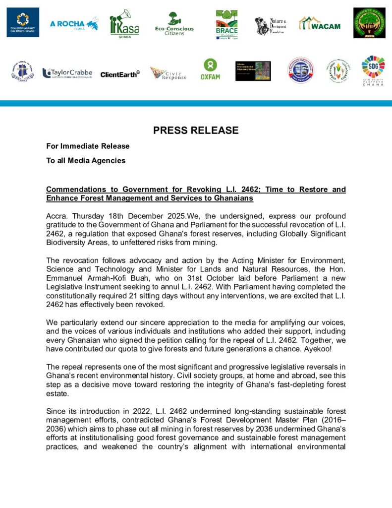 A coalition of environmental, faith-based, labour and civil society organisations has welcomed the revocation of Legislative Instrument (L.I.) 2462, describing the move as a decisive step toward restoring effective forest governance and protecting Ghana’s threatened forest reserves from mining activities.