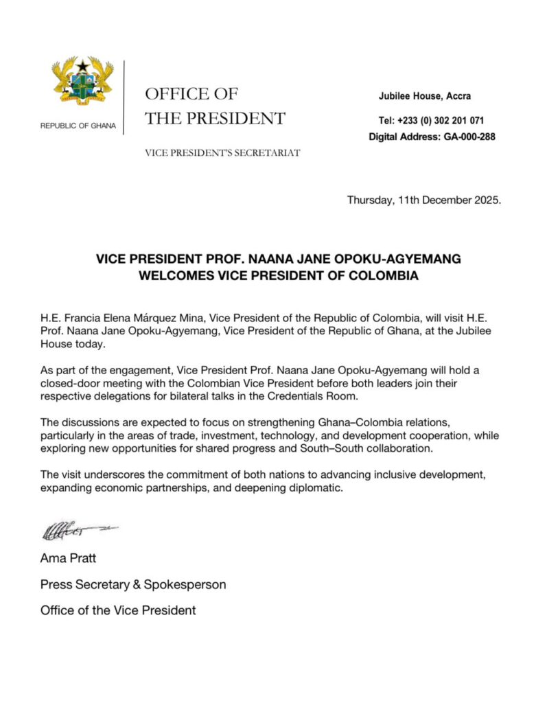 The statement was signed by Ama Pratt, Press Secretary and Spokesperson for the Office of the Vice President.