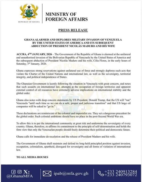 In a press release issued by the Ministry of Foreign Affairs and Regional Integration on Saturday, January 4, 2026, Ghana described the action as unilateral and unauthorised, warning that it poses serious threats to international peace, stability, and the global order.