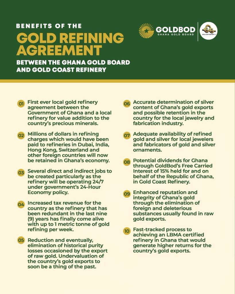 The agreement represents the first time the Government of Ghana has entered into a formal local gold refining arrangement with a domestic refinery, ending decades of dependence on foreign refineries in countries such as Dubai, India, Switzerland, and Hong Kong.