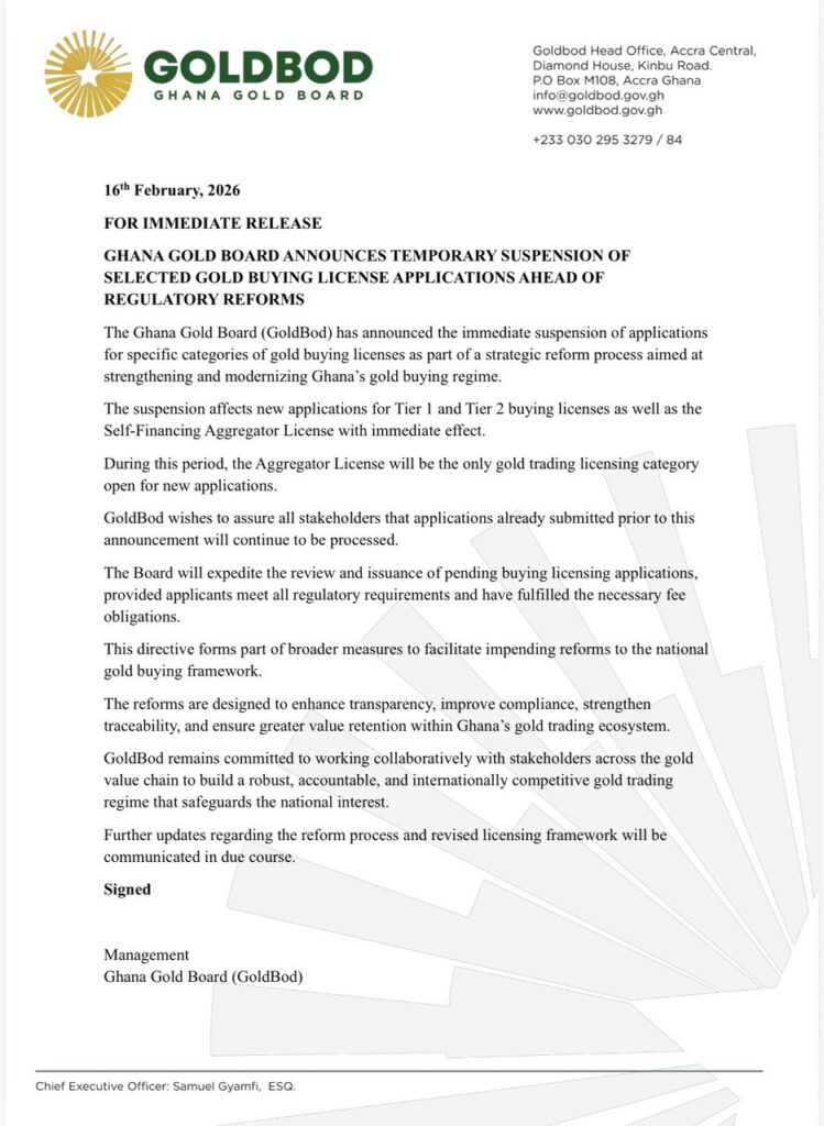 The Ghana Gold Board (GoldBod) has announced the immediate suspension of new applications for selected categories of gold buying licenses as part of sweeping reforms to strengthen and modernize Ghana’s gold trading regime.