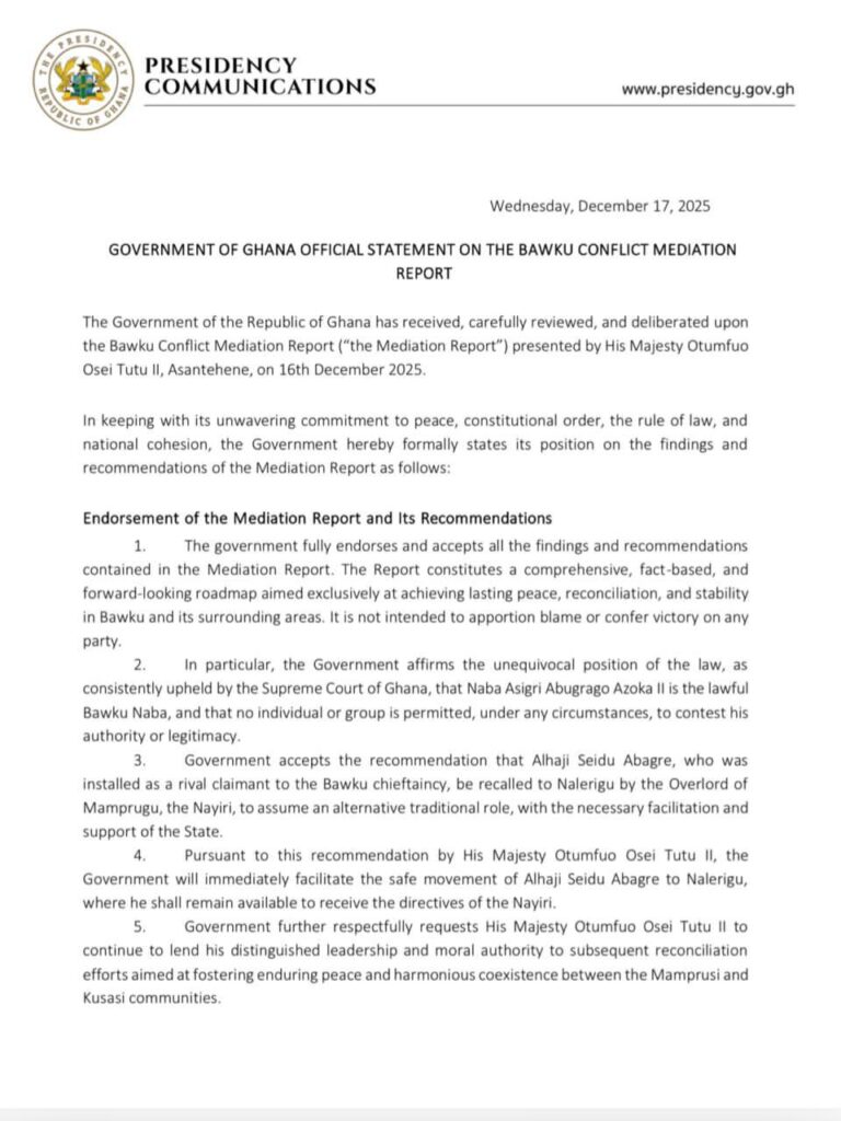 The Government of Ghana has endorsed the Bawku Conflict Mediation Report presented by the Asantehene, Otumfuo Osei Tutu II, and announced a GH¢1 billion Bawku Revitalisation Fund to support post-conflict reconstruction and development in the area.