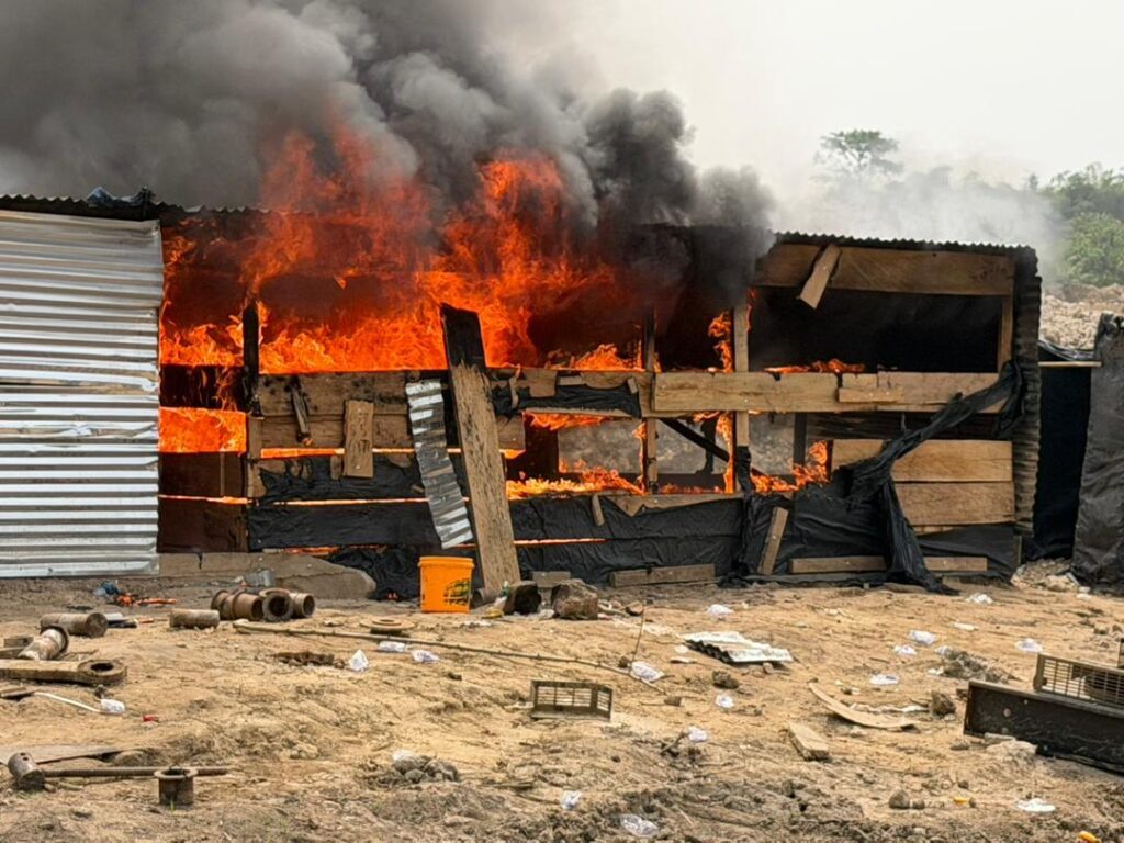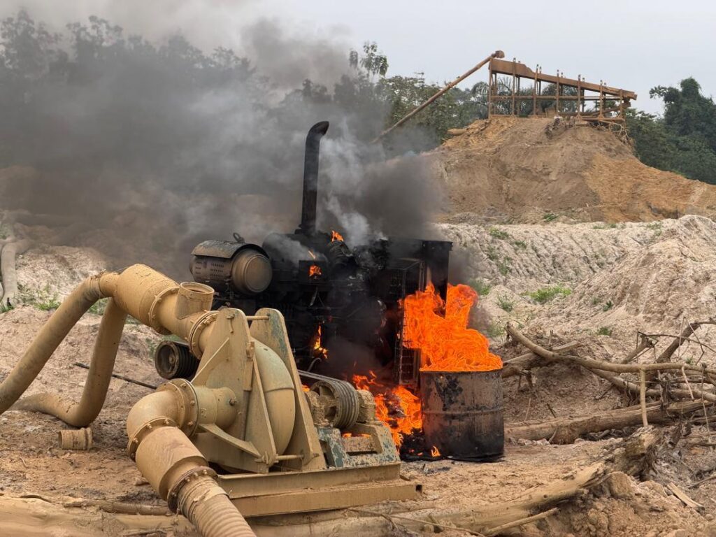 During the raid, the NAIMOS task force dismantled makeshift mining camps and logistics bases used by the illegal miners. Several items of equipment were destroyed on-site, including three heavy-duty multipurpose water pumping machines, gold washing platforms, generators, and washing pans.