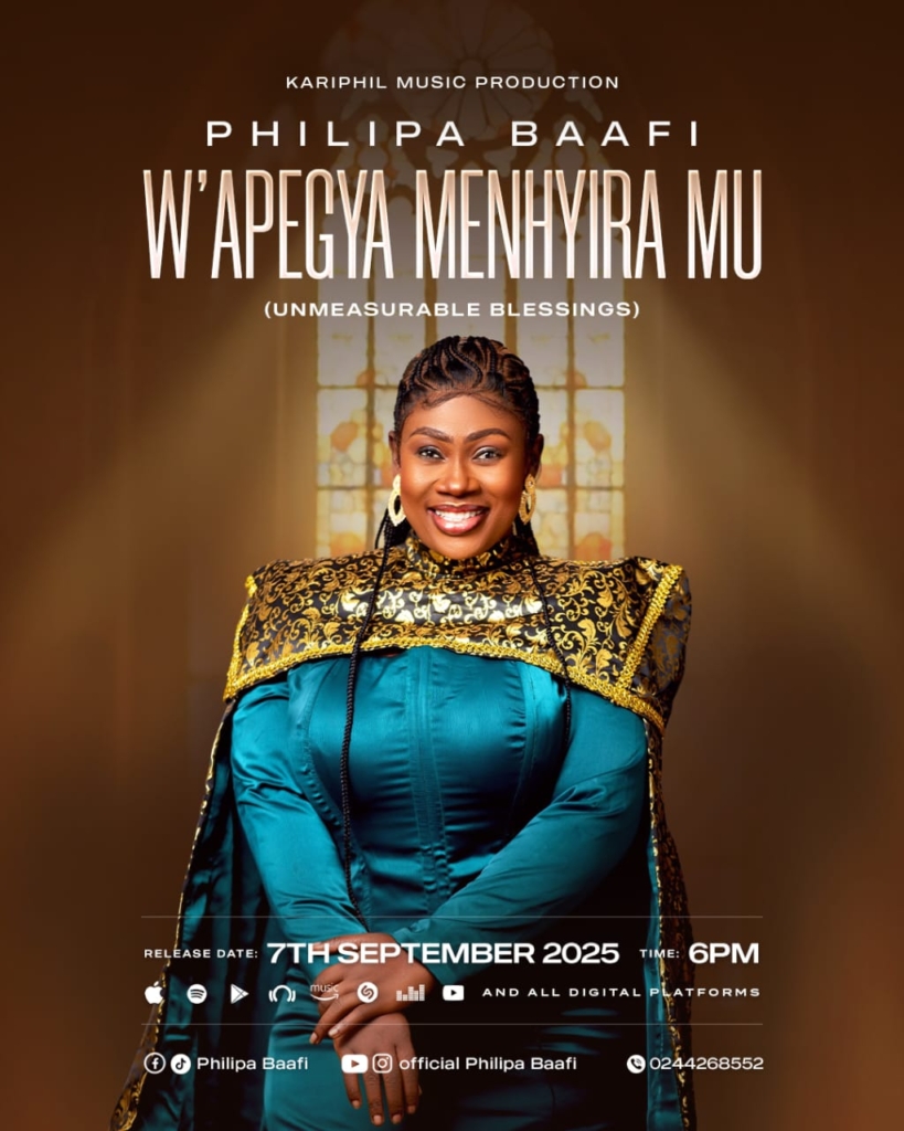Celebrated Ghanaian gospel musician and Physician Assistant, Philipa Baafi, has released a new single titled “W’apegya Me Nhyira Mu.” The inspirational track was officially launched on Sunday, September 7, 2025, at 6 p.m. and has since been trending on digital platforms and social media.