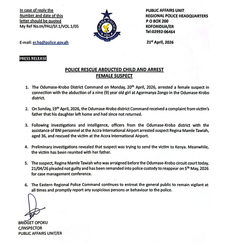 The Ghana Police Service has rescued a nine-year-old girl who was reportedly abducted from Agormanya Zongo in the Odumase-Krobo District of the Eastern Region, leading to the arrest of a 36-year-old woman suspected to be behind the incident.