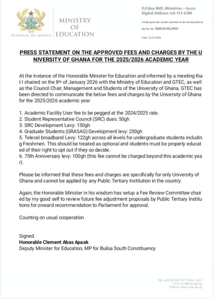 Additionally, a GH₵100 levy has been approved to mark the University of Ghana’s 75th anniversary. The Ministry clarified that this charge is strictly limited to the current academic year and cannot be extended beyond it.